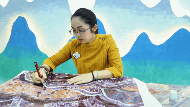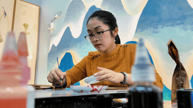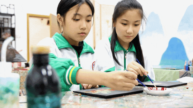 傍晚时分,漆艺课室亮起了暖光,李洁霞正在教孩子们制作漆画。作为广州市高水平美育团队(漆艺)负责人,李洁霞肩负着让漆艺传承新生的重任。在她的漆画工作室中,摆放着由漆画衍生的许多周边产品。